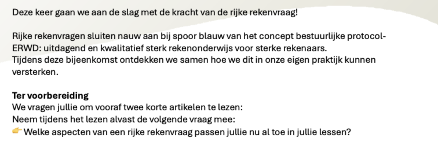 Het lerend netwerk rekenen staat in het teken van samen leren en versterken. We bundelen onze krachten om het rekenonderwijs naar een hoger niveau te tillen en bouwen zo aan een omgeving waarin uitwisseling, verdieping en inspiratie centraal staan. Dit netwerk is er niet alleen om kennis op te halen, maar vooral ook om inzichten te delen. Of je nu een succesvolle aanpak hebt om met anderen te delen, of met een vraag zit waar je zelf tegenaan loopt – samen komen we verder!